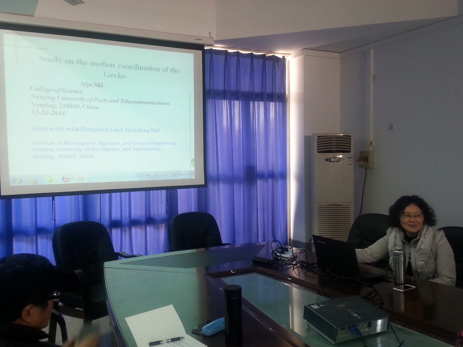 2014年12月24日下午13:30,理学论坛第四十九次学术活动在我校仙林校区教2-501会议室如期举行,论坛邀请理学院石爱菊副教授做了题为“Study on the motion coordination of Gecko ”的学术报告,理学院院长李雷教授、书记温勇教授、副院长唐加山教授以及理学院的部分师生参加了报告会,报告会由理学院副院长唐加山教授主持。
