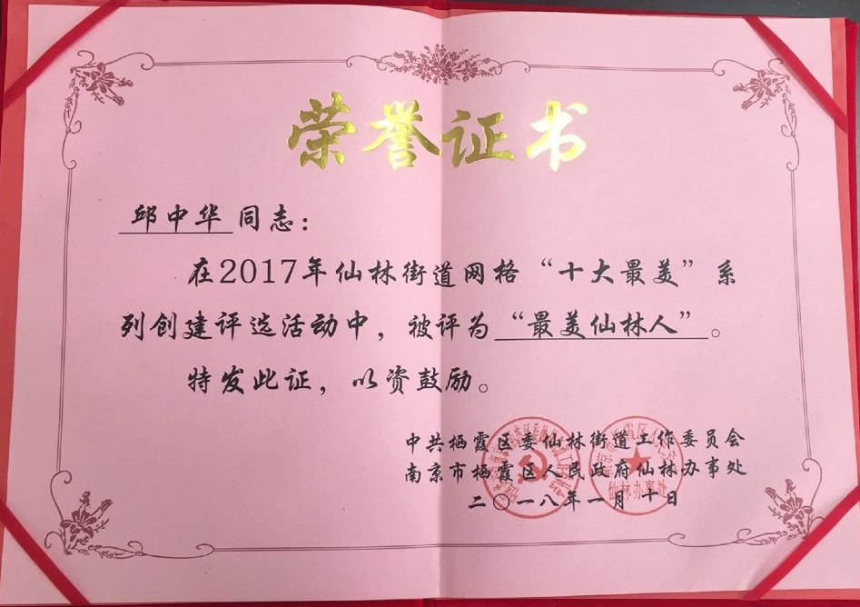 在2017年仙林街道网格“十大最美”系列创建评选活动中,我院邱中华老师被评为“最美仙林人”,特此祝贺!