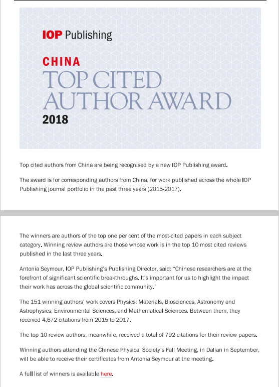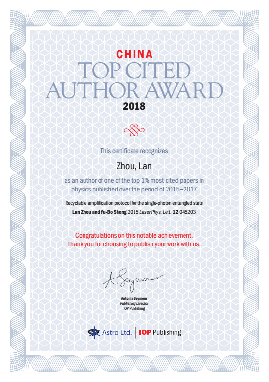 近日,英国物理学会IOP 出版集团宣布颁发“2018年高被引中国作者奖”。获奖作者在过去三年间(2015-2017)曾以通讯作者身份于IOP及其合作期刊上发表文章,且这些文章的被引次数在所属领域全球排名前1%。本次获得表彰的151位杰出作者的研究领域覆盖物理、材料、生命科学、天文学和天体物理学、环境科学以及应用数学等领域。我院应用物理系周澜副教授以第一、通讯作者身份在IOP出版集团旗下的Laser Phys. Lett.期刊合作发表的题为“Recyclable amplification protocol for the single-photon entangled state”论文获得该奖项。IOP出版总监Antonia Seymour将于九月十四日在大连举办的中国物理学会秋季年会上为这些获奖作者颁发证书。