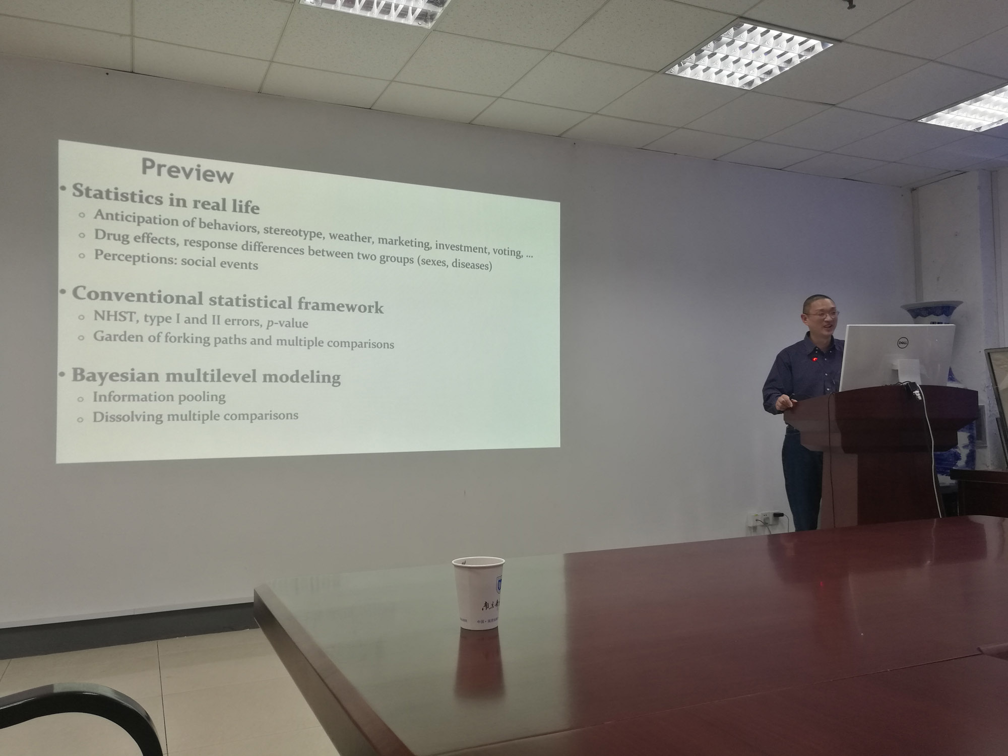 在报告中,陈刚博士结合自身的研究经历,分享了对传统的统计分析局限性的认知过程,并讨论了一种不同的分析方式:抛弃传统的建立在没有任何效应的控制第一类错误的做法,通过信息共享的途径,实现更为有效的统计建模方式: Bayesian Multilevel (BML) modeling。陈刚博士还介绍了自己在运用BML建模方面的经验,以及成功地应用于大脑成像数据的一些分析方法的历程。