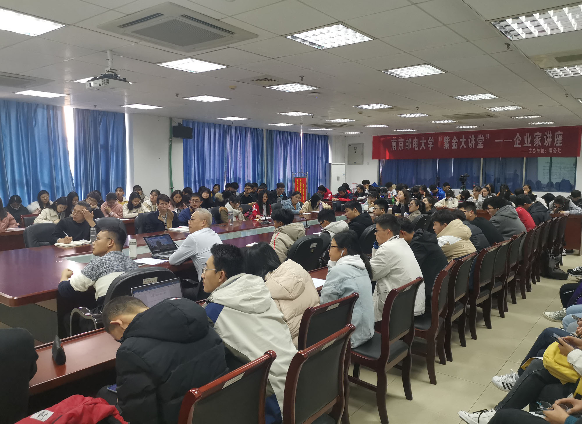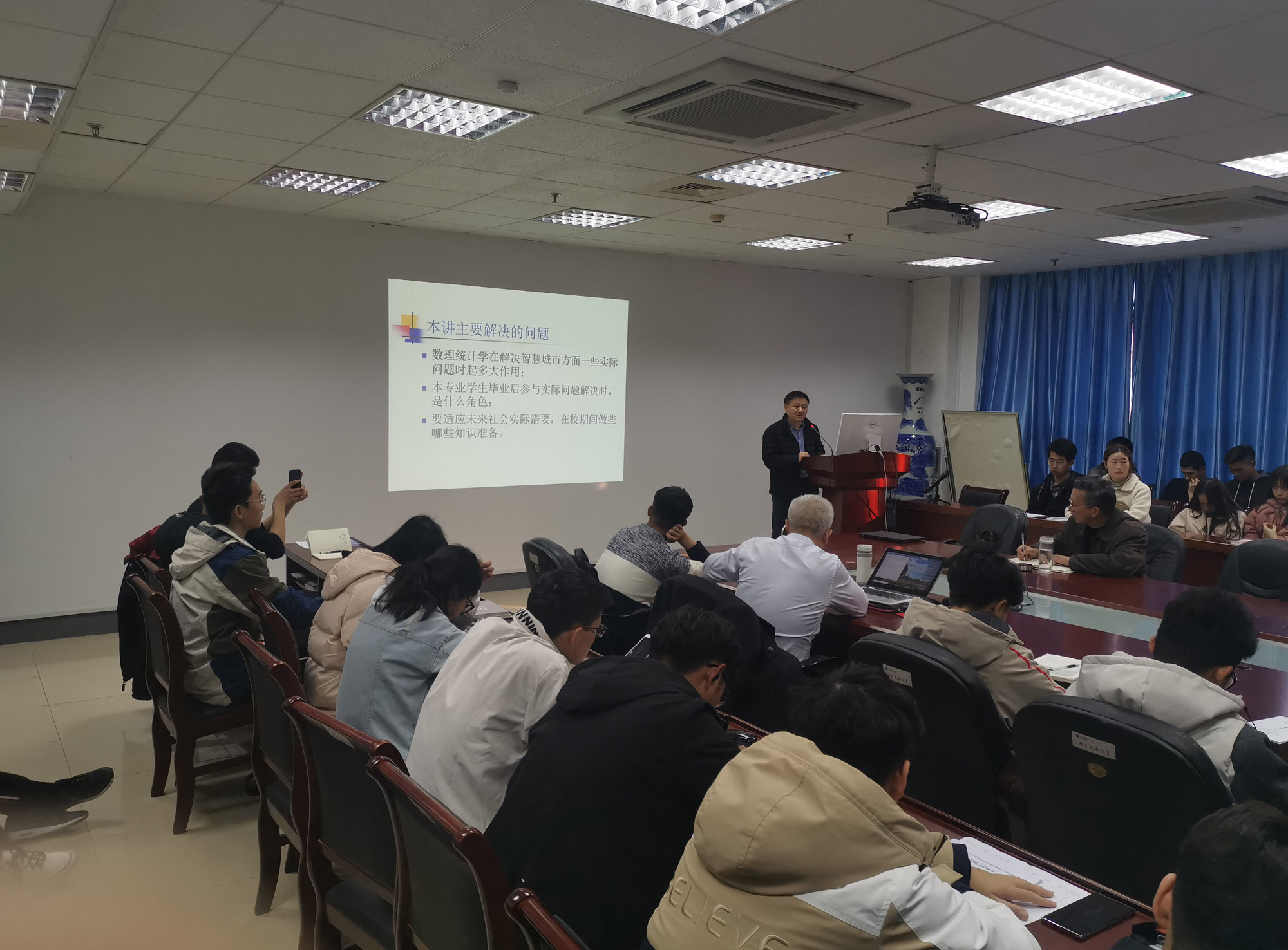 理学院副院长赵洪牛老师、数学及应用统计专业硕士研究生、应用统计学专业本科生,以及来自通信与信息工程学院、计软网学院、自动化学院、物联网学院、地理与生物信息学院、现代邮政学院、传媒与艺术学院、经济学院等学院的部分学生参加了报告会。
