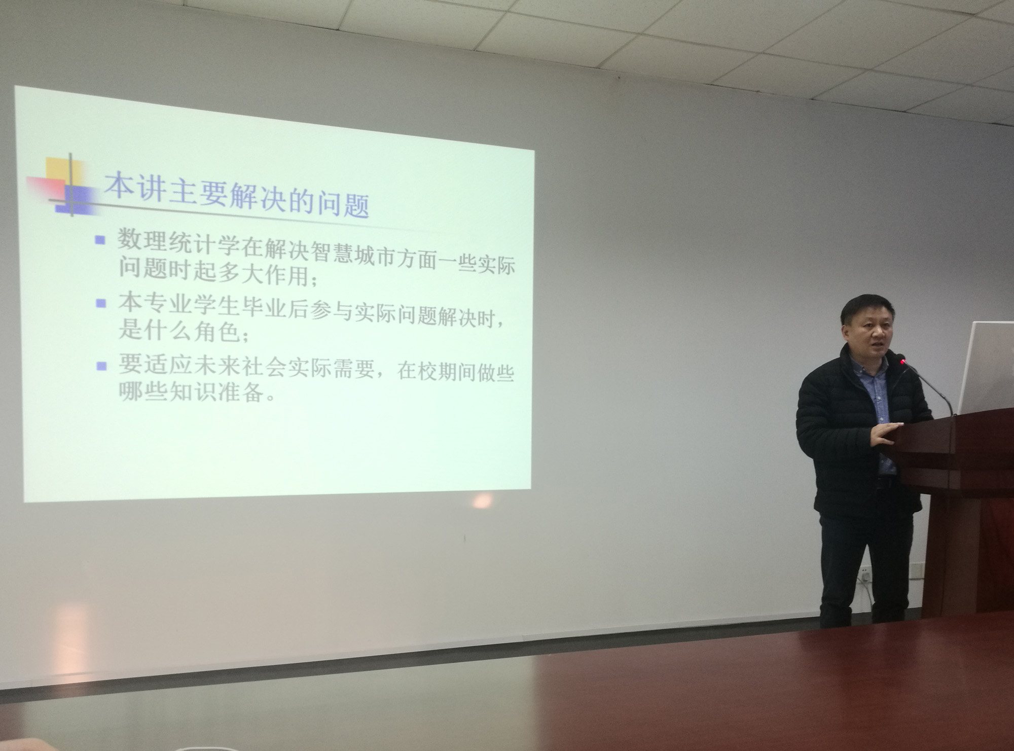 周正康老师从智能企业所具备的特点、对数据人才的需求、数据科学家必备的五大技能等方面介绍了大数据时代企业发展趋势,周老师以智慧设施结构安全检测以及智慧停车系统等实际案例为载体介绍了数据的收集、数据的分析等统计学的思想和方法在解决智慧城市实际问题中的应用。另外,周老师还以自身的经历提醒同学们在校期间需要做哪些知识的准备以便适应未来社会的发展需求。周老师的报告深入浅出,内容丰富,引起了与会听众的广泛兴趣,报告会后,周老师详细回答了听众的提问,并与师生进行了热烈的讨论。