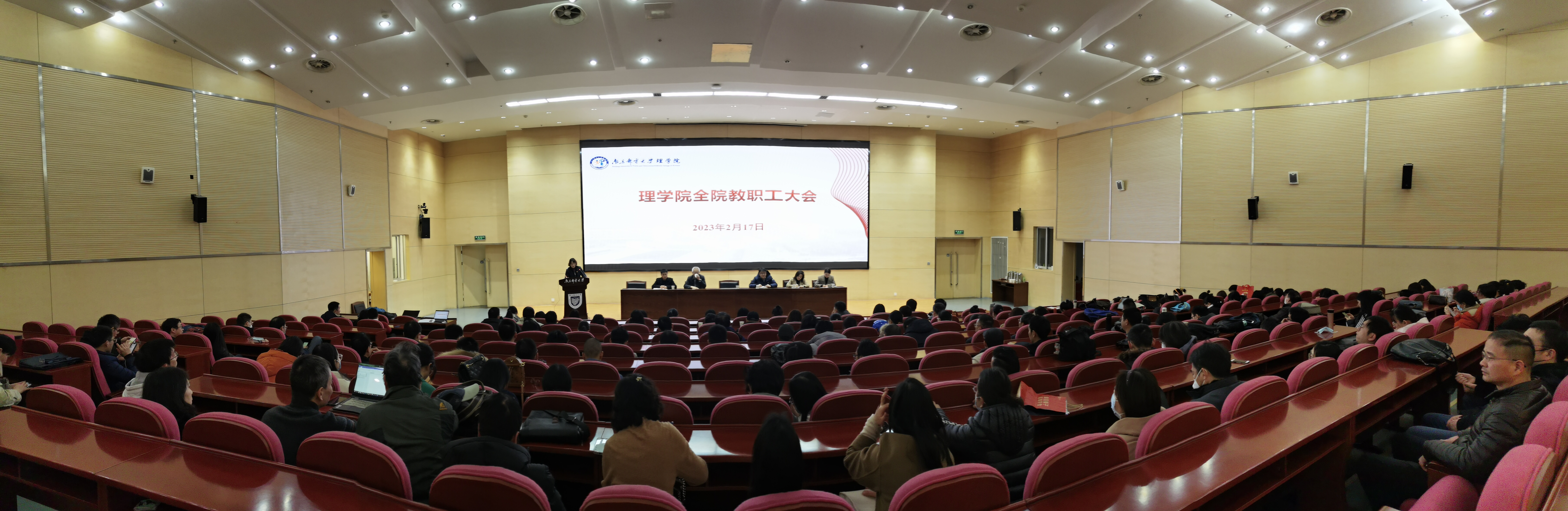 2023年2月17日,理学院在仙林校区图书馆四楼报告厅召开全体教职工大会,学院全体教职工参加。大会总结回顾2022年各项工作,并安排部署学院2023年重点工作。会议由党委书记尹志丽主持。