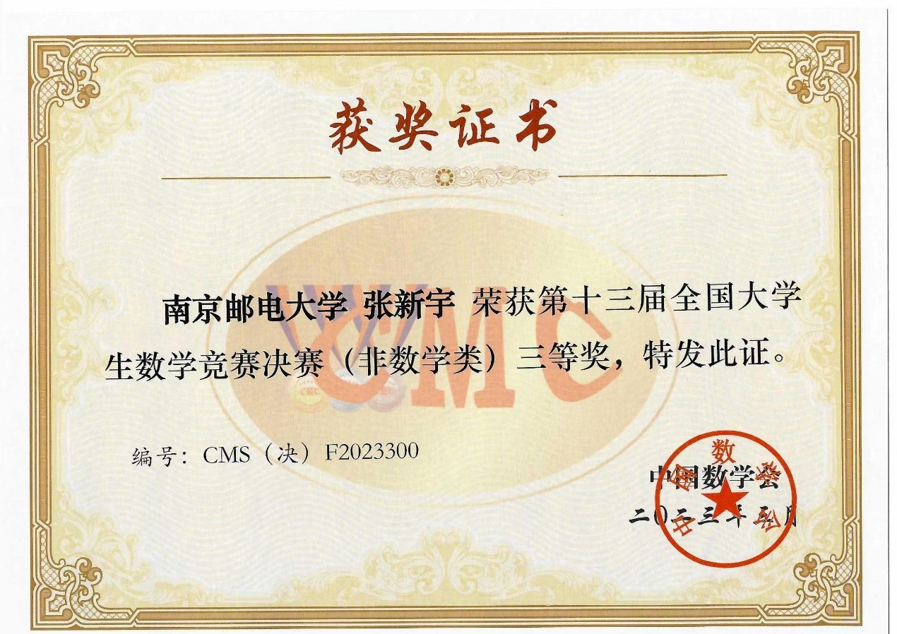 第十三届全国大学生数学竞赛(江苏赛区)于2021年11月举办,一个月后成绩揭晓。高等数学竞赛教练组得知张新宇进入决赛,立即开展有针对性地辅导和培训,线上、线下答疑,全程跟踪指导。因决赛延期举办,原参赛计划被打乱。张新宇在这一年多的备赛时间中,除了认真完成学业(绩点与综测均为专业第一)之外,同时参加了其它赛事和暑期夏令营,顶住了升学和写论文等多重压力,在理学院高数竞赛教练组的全力支持和精心指导下,进行了短期冲刺备赛,不仅取得了此次决赛三等奖的好成绩,还顺利保研到浙江大学。