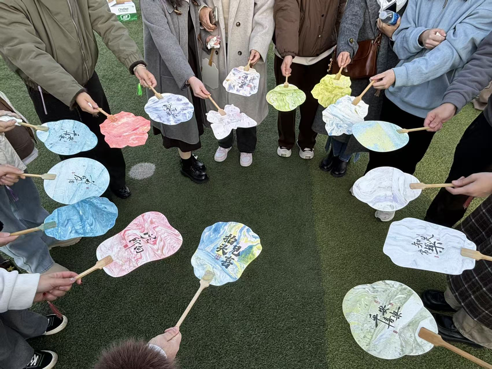 在美育漆扇DIY环节,学院为同学们准备了多种白扇、颜料、水桶等材料,大家自由发挥创意,将内心的情绪与想法融入扇面创作中。专注的手工过程让同学们暂时脱离学业压力,在一笔一画的创作里实现专注放松,体验手工创作带来的情绪舒缓,每一把漆扇都成为大家情绪表达的载体。漆扇上书写的美好祈愿,恰是同学们内心对阳光心态、健康心理的真挚期许。