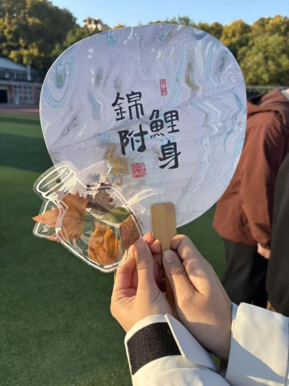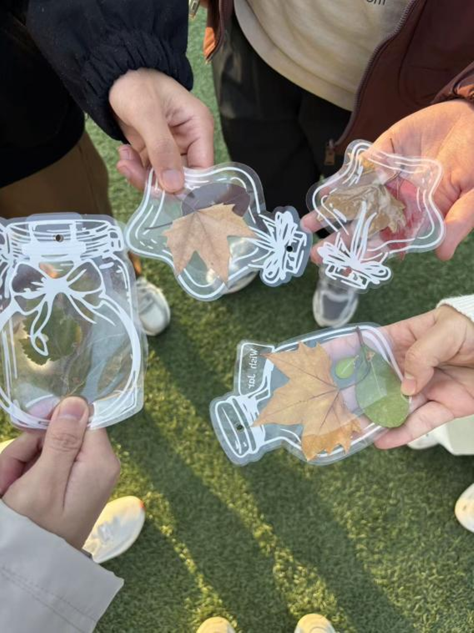 劳育实践环节持续40分钟,同学们走出教研室捡拾形态各异的落叶,再将其装进“心愿瓶”造型的透明卡片中。轻量的劳动体验让大家在大自然中感受“劳动中的情绪治愈”,落叶与创意载体的结合,既生动传递了内心的声音,也让压力在秋日户外轻松惬意的氛围中悄然释放。
