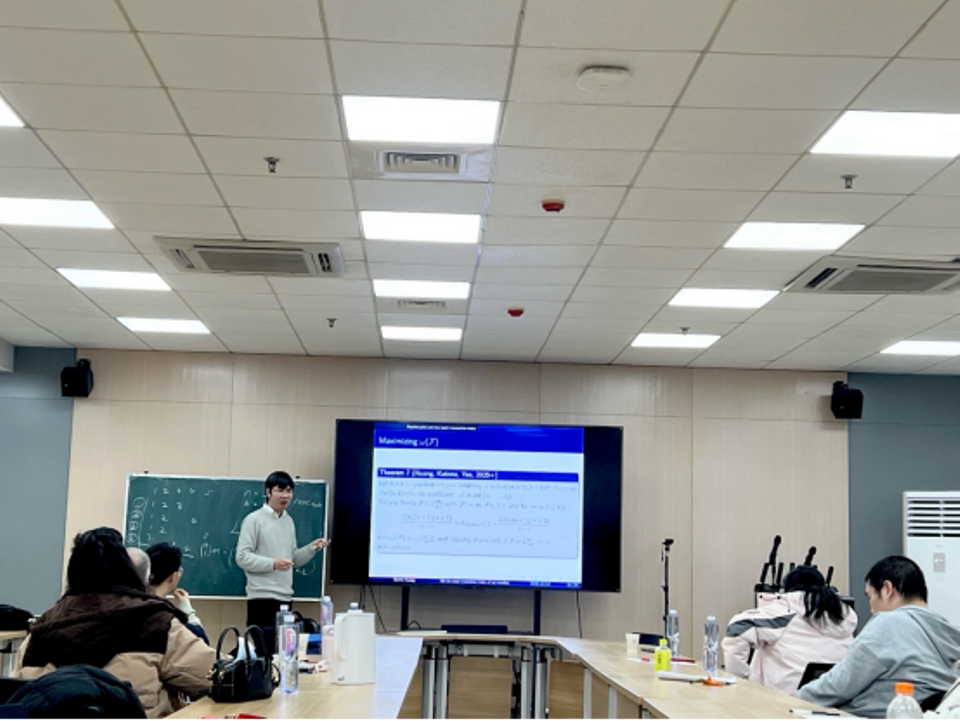 Győri教授是国际著名的极值图论专家,曾获得匈牙利科学院奖,成果丰硕。Győri教授介绍了1995年他与Erdős、Faudree合作的重要工作:与极值图论中经典的“图书”(Book)概念(由k个三角形共享一条公共边(书脊)所构成的特殊图结构)相关的重要结论。对于满足最小度δ(G) ≥ cn(其中1/2 < c < 1)的n个顶点图,他们证明了图中必然包含较大的图书,并对部分c值确定了能保证存在的最大图书页数b(c)。Győri教授将焦点转向了函数b(c)在所有c∈(0,1)上的完整行为。他介绍了一个基于有理数乘积表示的新猜想。该猜想如果成立,将揭示b(c)具有极为奇特的性质:它虽然是关于c的单调递增函数,却在每一个有理数处发生跳跃。这种“在每个有理数处跳跃”的函数行为在分析学中极为罕见,展示了极值图论问题与数论之间深刻而美妙的联系。