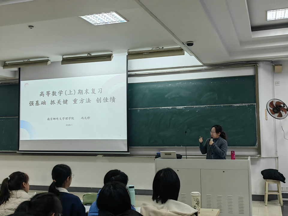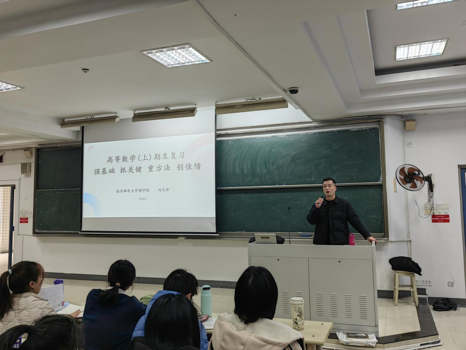 2026年1月12日,理学院“尚学理行”数学讲堂暨“柚学加油站”第八期高数期末复习讲座在南京邮电大学仙林校区教3-101教室顺利开展。讲座由高等数学教学中心蔡云峰主任主持,冯元珍老师主讲,吸引众多大一学子及教师参与。