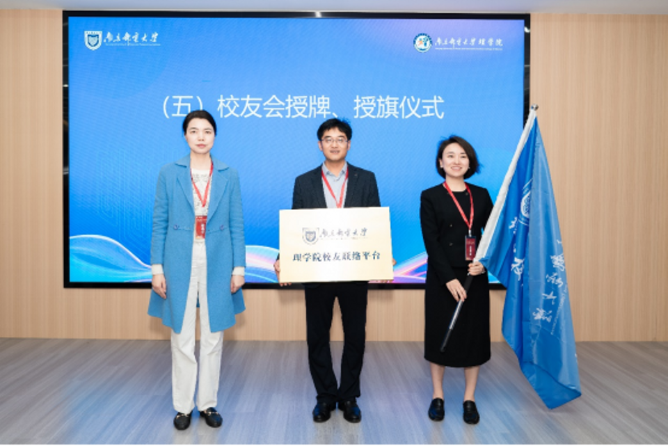 随后,大会举行了隆重的校友联络平台授牌、授旗仪式与聘任仪式。副校长胡纵宇代表学校为理学院学院第一届校友联络平台授牌。学院领导为首届理事会理事代表颁发聘书。